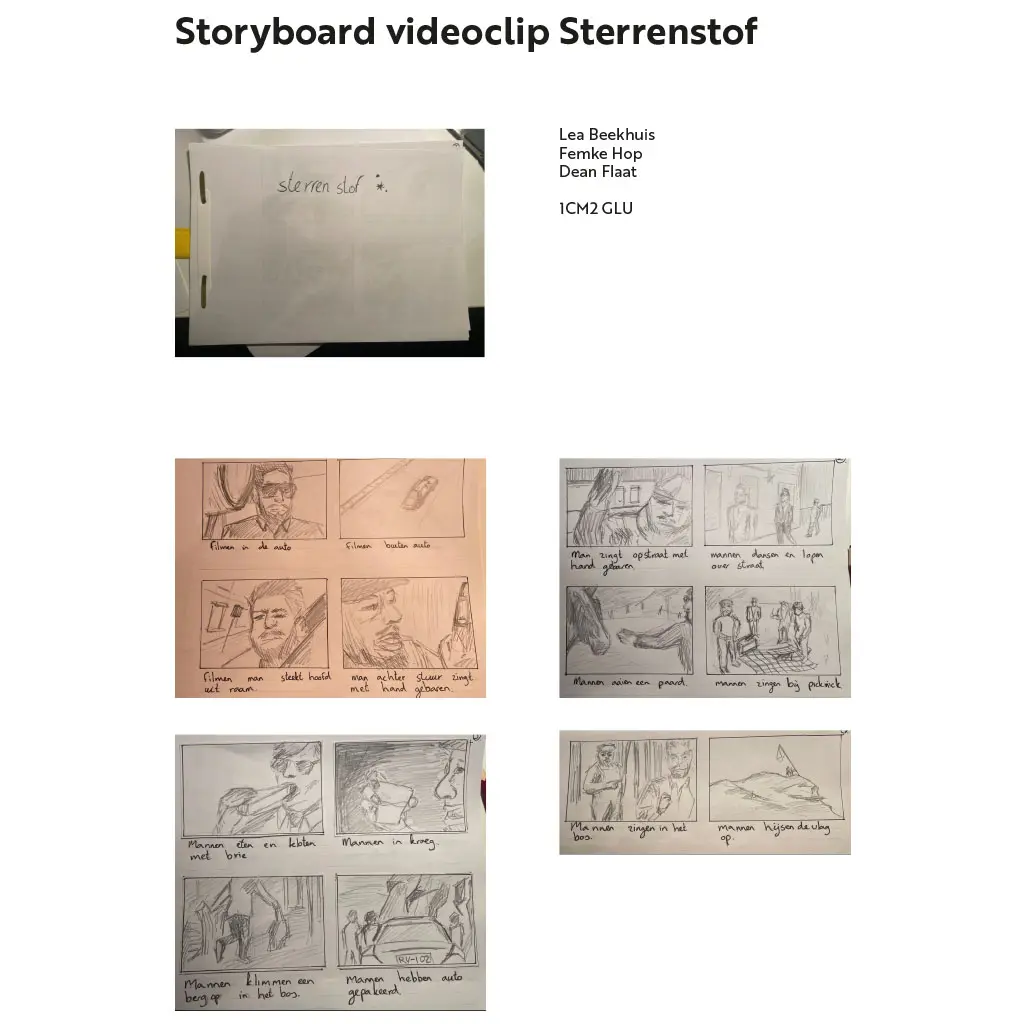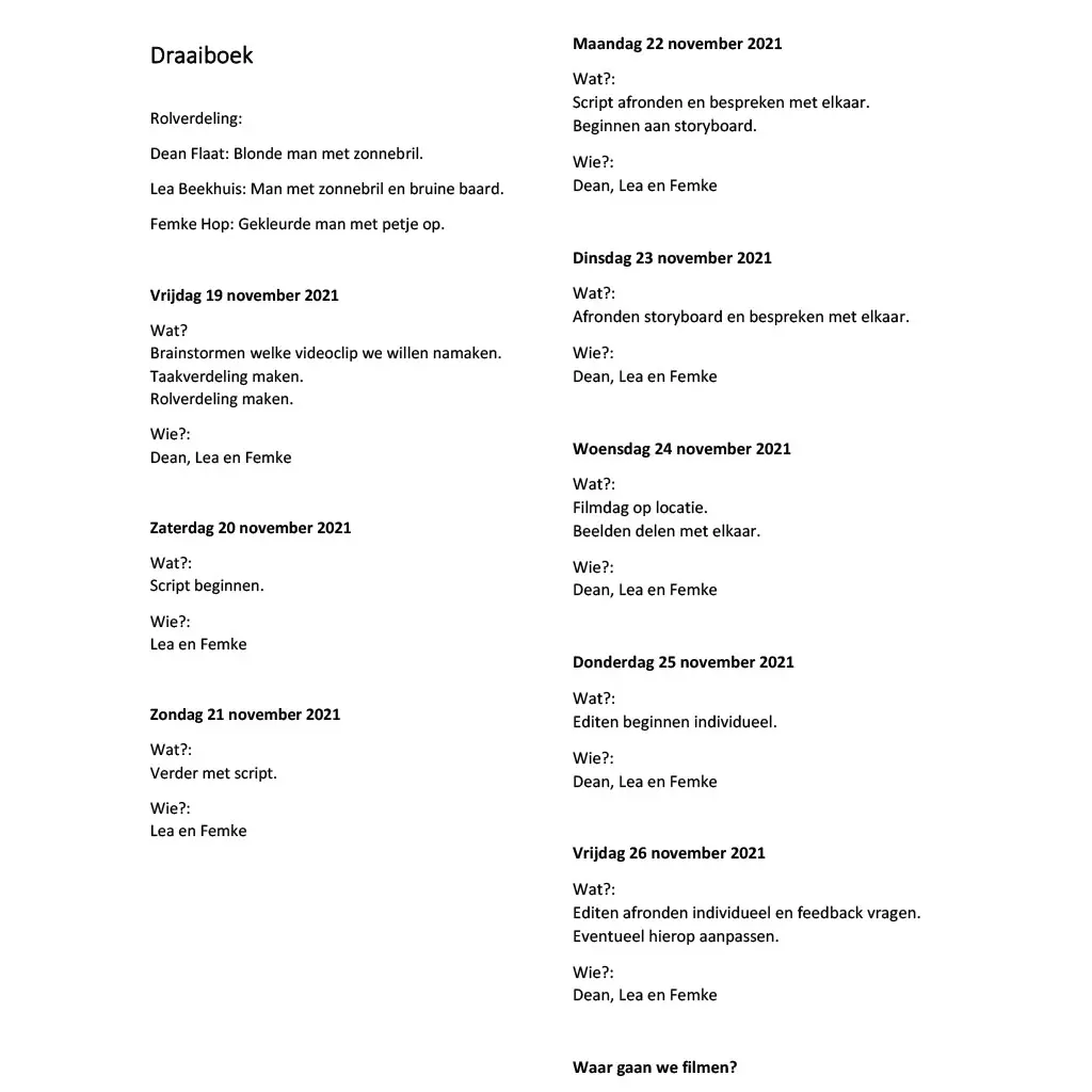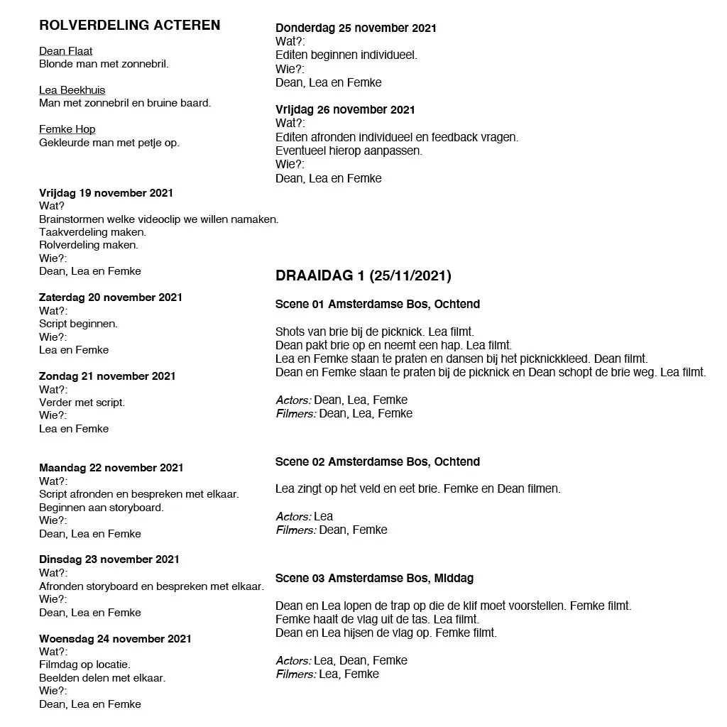 In een groep van drie hebben we besloten om een van de meest iconische Nederlandse nummers te kiezen voor onze muziekvideo. We vonden het leuk om een uitdaging aan te gaan en kozen daarom voor een nummer van De Jeugd van Tegenwoordig, bekend om hun creatieve en vaak eigenzinnige muziekvideo's. We hebben een storyboard gemaakt en een script geschreven, waarbij we rekening hielden met props, locaties, camera-apparatuur en kleding. Vervolgens hebben we een dag ingepland om te gaan filmen.