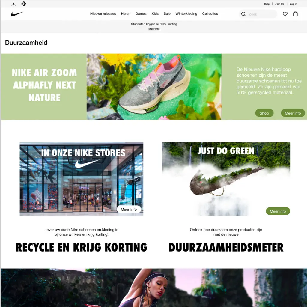 Voor het webdesign heb ik enkele ideeën bedacht om mensen te stimuleren om duurzamer te leven. Zo heb ik een recycleprogramma voorgesteld, waarbij mensen oude Nike producten kunnen inleveren in ruil voor een kortingscode bij hun volgende aankoop. Daarnaast heb ik een "duurzaamheidsmeter" geïntegreerd op de website, waarmee klanten kunnen zien hoe duurzaam een product is voordat ze het aanschaffen. Dit helpt hen bewuster te consumeren.